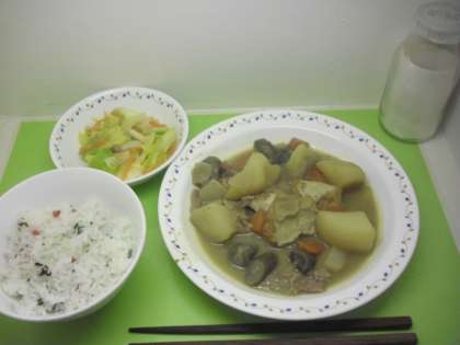 梅わかご飯 牛乳 五目うま煮 キャベツのレモンじょうゆかけ