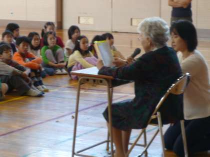 今日の6校時、本校の児童のひいおばあちゃんにあたる、河村利子さんが、4年生の子どもたちに、終戦直後満州からの引き揚げのときの様子や苦労話をお話ししてくださいました。河村さんの優しく臨場感あふれる語りに、子どもたちは引き込まれて真剣に聞き入っていました。当時の手作りのリュックサックや背負い袋などを見せながら、めったに聞けない当時の人々の生き方について知ることができました。今学習している、国語の「一つの花」の内容とダブって子どもたちの心に染みたことと思っています。ありがとうございました。