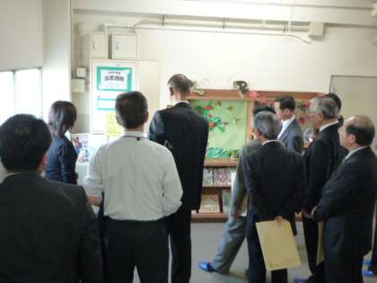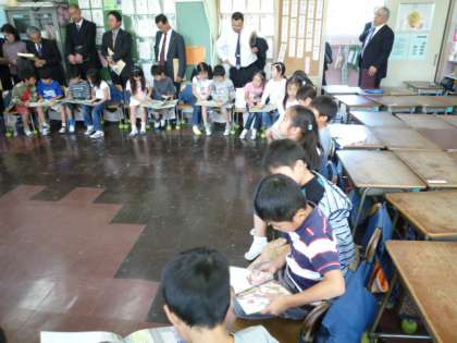 今日のお昼に、新潟県燕市の教育委員長や教育長の方々総勢11名の方々が、玉川小学校の読書指導や図書館利用の様子などの視察にお見えになりました。本校が「読書力の育成」という世田谷区教育委員会の研究課題校になっている関係です。1年2組と3年3組の学級の図書の授業を興味深く参観されました。また、本校の図書室の図書職員の鈴木さんから、本校が保護者や地域の方々のボランティアの方々に支えられて、読書活動が行われていることの説明があり、とても感心して聞き入っていました。