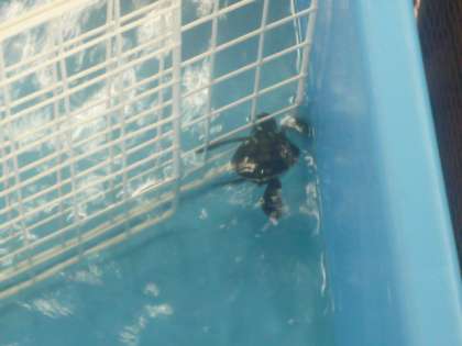 先週やってきた、アオウミガメ君。元気に水槽の中を泳ぎまわっています。食欲もあり、少しずつこの環境に慣れてきているようです。よく見ると、2匹の個性の違いはもう現れていて、せっかちとおっとりの2匹のようです。時々、仕切り板に首と手を引っ掛けてお休みポーズをとるしぐさがとても愛らしいです。