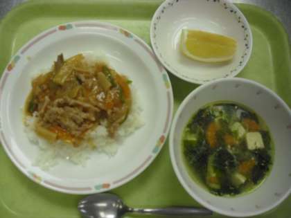 スタミナ丼 牛乳 わかめスープ くだもの(河内晩柑)