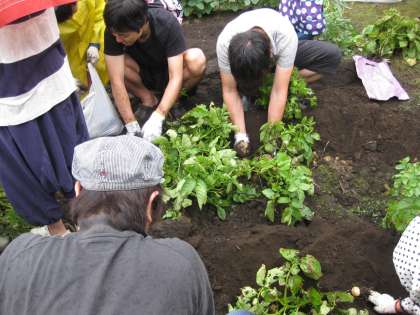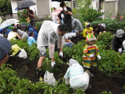 22日(日)10時、あいにくの小雨模様の中、カッパ、軍手、長靴、袋と準備も万端で野毛公園に集まり、その後、木村農園に向かいました。例年のこのジャガイモ堀りは、本校の学校協議会主催の行事の一つで、事務局の木村礼二様のご協力で実施しているものです。抽選で選ばれた40組の親子がジャガイモ堀りを楽しみました。帰りには、袋いっぱいのジャガイモを重たそうに持って各家路に帰って行きました。どんなジャガイモ料理が食卓に上ったのでしょうか。さぞ美味しかったことでしょう。