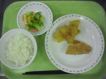 ごはん 牛乳 鯖のピリ辛ソースかけ じゃがいもの甘辛煮 野菜の甘酢あえ