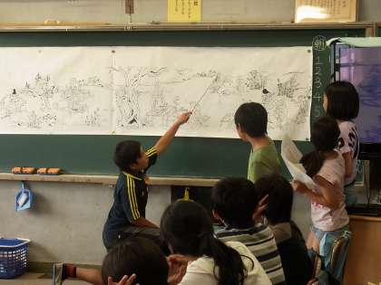 鳥獣戯画を自分たちで解釈し、他のクラスの友達に発表するという学習を行いました。