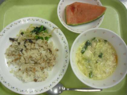 ビビンバ 牛乳 ニラ玉スープ くだもの(小玉すいか)