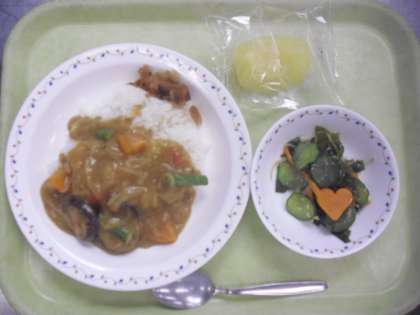 夏野菜のカレーライス 牛乳 福神漬 わかめサラダ 冷凍アップル