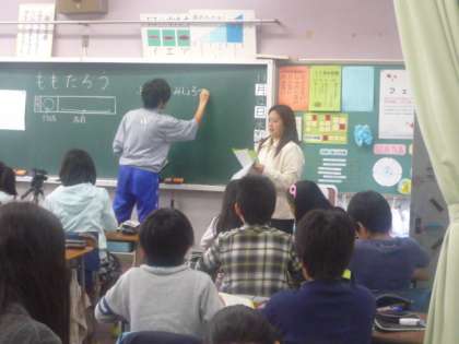5年生では、学習発表会で方言を使った昔話の劇を計画しています。方言については、教科「日本語」の授業でも扱っており、子どもたちの興味関心も高まっています。今日5年3組に行くと、「ももたろう」の劇のグループでした。「ももたろう」は鹿児島県のことばを使って、劇仕立てにして練習する前に、登山くんのおかあさんに鹿児島県の奄美大島の言葉で紹介がありました。みんな初めて聞く言葉に,びっくりするやら発声の難しさに戸惑うやら、でした。これから2週間の練習によって、どう変わっていくかとても楽しみです。