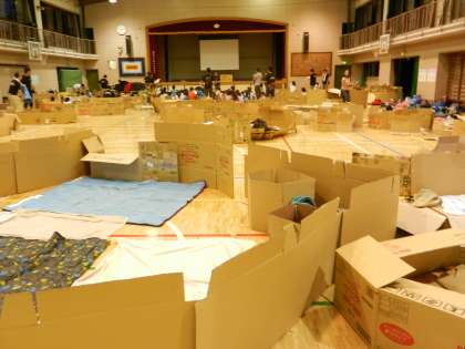 2時30分集合。8班編成のあと、おやじの会会長の関口さんの挨拶で開会式、その後早速、各種防災訓練開始! 通報訓練、消火器訓練、放水訓練、煙ハウス体験、AED体験の5つの訓練を行いました。夕方以降は非常食のカレーライス、ダンボールで自分たちの寝床作り、そしていよいよ夜の学校探検に・・・!!!とっても充実した訓練となりました。10時には就寝の予定です。