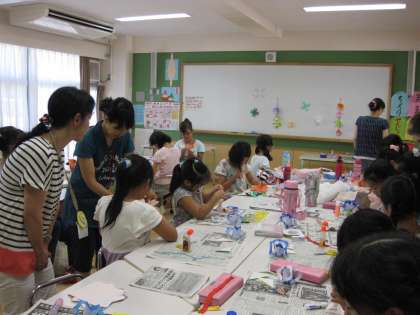 折り紙を折って、切って、貼って素敵な立体的お花ができました。出来上がった花をコサージュとして胸や頭に付けたり、数個を繋げたりなどして、華やかな自分を発見していました。
