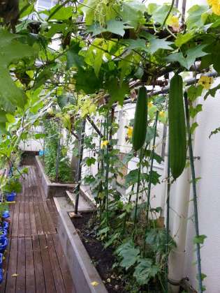4年生が育てているヘチマが実ってきました。今年はなかなか実がつかず、心配でしたが、立派なヘチマができてきました。中庭(駐車場側)です。