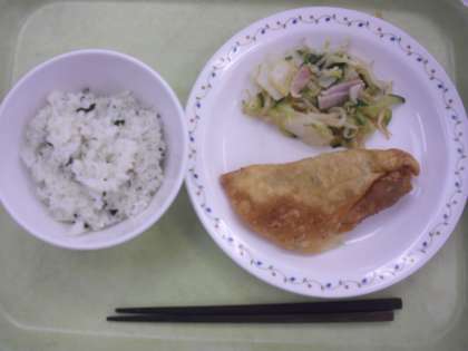 わかめとじゃこのごはん 牛乳 ジャンボ餃子 白菜の中華サラダ