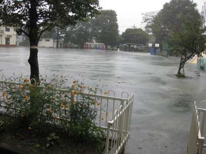 午前7時において、区内に警報が発令されていたため、午前7時に学校緊急メールで休校のお知らせを配信しました。学校の校庭は池のような状況です。