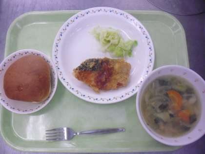 ミルクパン 牛乳 魚のフライ ゆできゃべつ 野菜スープ
