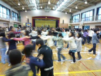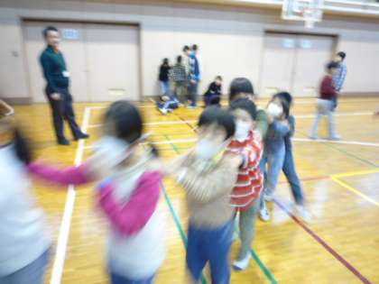 学習発表会が終わって、ほっとした雰囲気の中で、集会委員会主催のジャンケン列車集会がありました。体育館の中で、1年から6年生が(5年生は社会科見学)学年を超えてジャンケンをしながら、負けた人が勝った人の肩に手をやって、列車のように伸びていくゲームです。子どもたちが楽しそうにゲームをしていました。
