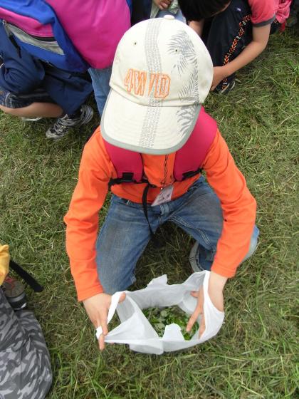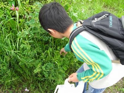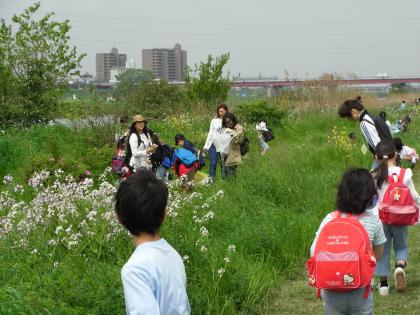 3年生が「総合的な学習の時間」に「多摩川のびのび学習」でよもぎ摘みに行きました。学校から歩いて25分。フレンドシップの方々17名の手助けをいただきながら、多摩川の土手近くでよもぎを見つけ、ビニルに集める活動を行いました。はじめは、どれがよもぎかわからない子どもたちでしたが、次第に見分けができるようになり、せっせと摘んでいました。5月2日(金)には、これを使ってよもぎ団子を作る予定だそうです。楽しみですね。