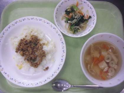 さばそぼろ丼 牛乳 野菜のからし醤油あえ 吉野汁