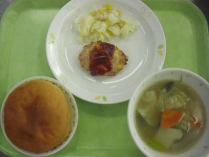 ミルクパン 牛乳 アップルチーズハンバーグ コーンポテト 野菜のスープ煮
