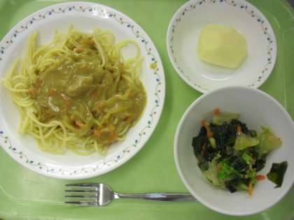 スパゲティカレーソース 牛乳 わかめサラダ くだもの(りんご)