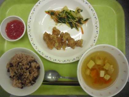 赤飯 牛乳 鶏のから揚げ きのこ入り煮びたし すまし汁 紅白ゼリー