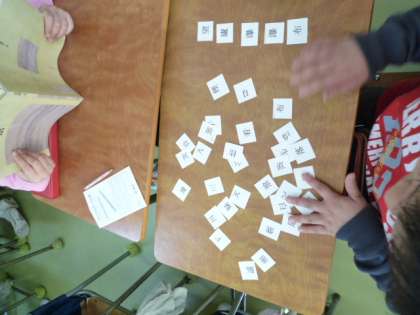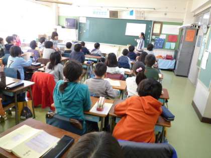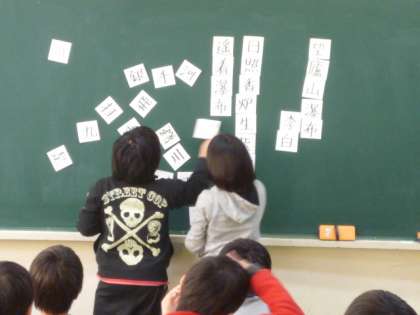 4年1組で、武先生の授業研究を日本語で行いました。李白の漢詩「望廬山瀑布」を勉強していました。初めに白文を提示して先生の後に続いて2,3回群読しましたが、声に自信がなく、ちんぷんかんぷんな様子でした。そのあと、先生から漢字の雰囲気について聞かれたり、答えたりしているうちに、段々と理解が進むとともに読み方もスムーズになってきました。そのあと、一字一字の漢字をカードにしたものを並び替える活動を行いました。みんな必死になって、漢詩を口にし、覚えて並べ替えていました。子どもたちの記憶力のすばらしさにただただ感心させられました。男女とも仲良く一生懸命勉強している様子がうかがえました。