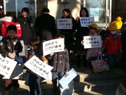 今日から、あいさつ運動がはじまりました。早く登校した子は玄関前でカードをもって大きな声で「おはようございます!」とあいさつ、にぎやかな一日のスタートです。