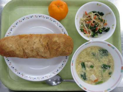 きなこ揚げパン 牛乳 塩ナムル にら卵スープ くだもの(ぽんかん)
