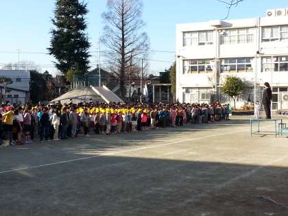 月曜日、全校朝会からはじまります。 寒い中、みんなしっかりと並んで校長先生、看護当番の先生のお話を聴いていました。