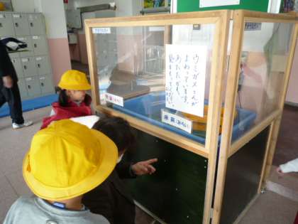 待ちに待ったアオウミガメの名前が決定しました。飼育委員会の子どもたちが全校に呼びかけ、出てきた名前を投票し集計した結果、次のように名前が付けられました。「未来(みらい)」と「宇宙(そら)」という名前です。すてきな名前ですよね。今少し元気がなくみんなが心配しているほうを、未来。食欲旺盛で、元気いっぱいのほうを宇宙としました。名前のお披露目を全校朝会の場で行いました。みんなとても気に入っているようです。3学期元気に声かけをしてください、