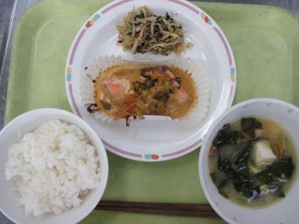 ごはん 牛乳 鮭のチャンチャン焼き 青菜の乾物あえ 味噌汁