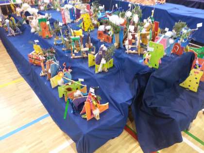 体育館に、4年生の作品がならびました。講師の先生より、「子どもは生き生きと表現しています。素直な子どもたちですね。」とコメントをいただきました。