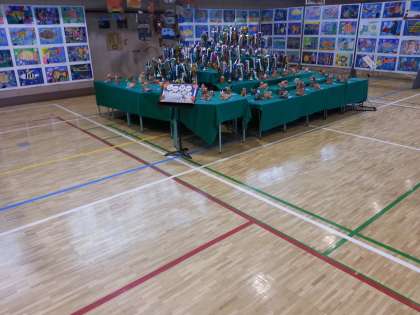 いよいよ展覧会前日となりました。3年生のトロフィーとシーサーがならび、会場に作品が揃いました。