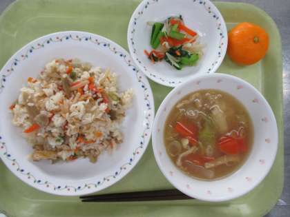 とりめし 牛乳 すいとん おひたし くだもの(みかん)