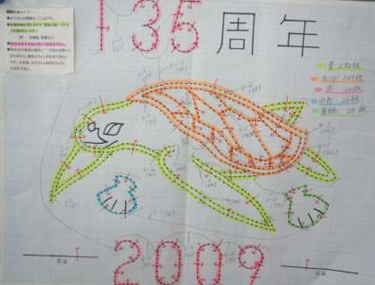 いよいよ明日は、始業式。3学期のスタートの日になります。明日は、創立135周年記念の下敷きに載せるために、始業式後に「航空写真」撮影と4校時終了間際に全校児童の集合写真撮影があります。記念の写真を撮りますので、病気以外の人は登校し、写真に入りましょう。校庭には、写真のようなアオウミガメをあしらった絵を全校児童と教職員で描きます。どんな航空写真になるかご期待ください。