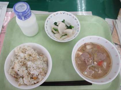 豆ご飯 牛乳 かぶの甘酢漬 いわしのつみれ汁