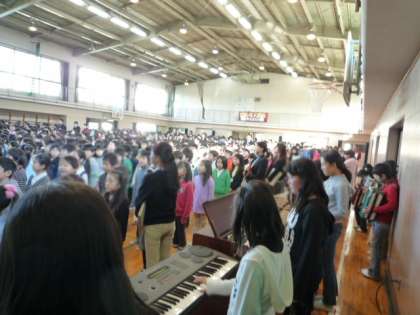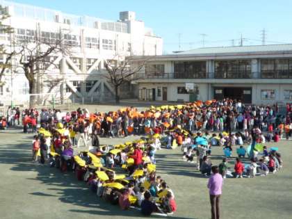 すばらしい天気に恵まれ、平成22年のスタートが切られました。校門近くの紅梅も赤いつぼみが膨らみかけ、新春をお祝いしています。子どもたちは、体育館で始業式を行い、児童数755人でスタートです。そのあと、校庭で航空写真用の隊形に移動し、セスナ機が上空から写真を撮るまでカラーボードを持って待っていました。どんな写真に出来上がるかとても楽しみです。子どもたちが135周年の記憶に残るといいなと思います。