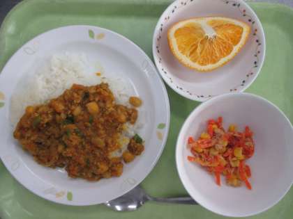 ひよこ豆のカレーライス 牛乳 人参サラダ 果物(スイートスプリング)