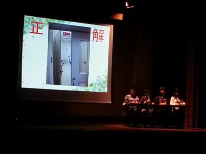 今日のスタートは、委員会紹介集会。放送委員会のみなさんが、工夫を凝らした紹介をしてくれました。一日の放送委員会の活動を、クイズにしたり、スライドで紹介しました。暗い体育館で、全児童が熱心に発表を聴いていました。