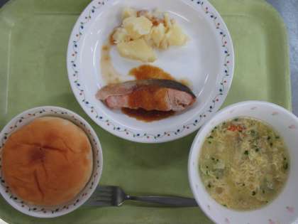 パインパン 牛乳 鮭のステーキソース 粉吹芋 卵スープ
