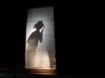 今日は体育館でシルエット集会。暗くしたステージに、先生のシルエットがうつります。さて、これは誰でしょう?