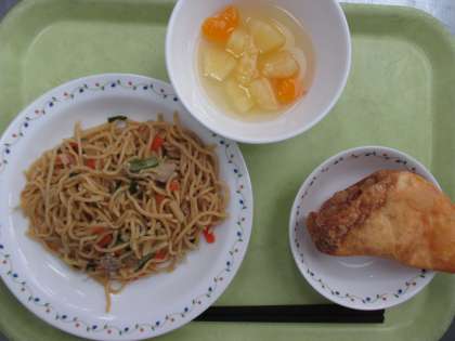 塩やきそば 牛乳 ツナとポテトのパリッと揚げ フルーツパンチ