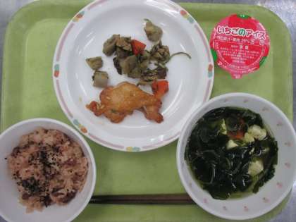 赤飯 牛乳 鶏肉の南蛮焼き 刻み昆布の五目煮 すまし汁 いちごのアイス