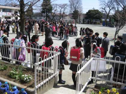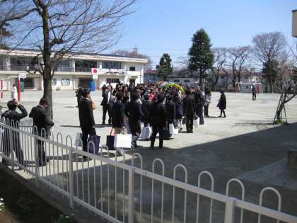 笑顔で門を出ていく子どもたち、君たちの前には輝かしい未来が待っています。