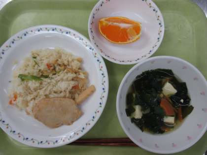 たけのこご飯 牛乳 鮪のしょうが焼き すまし汁 くだもの(デコポン)