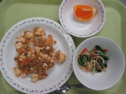 麻婆豆腐丼 牛乳 ナムル くだもの(清見オレンジ)