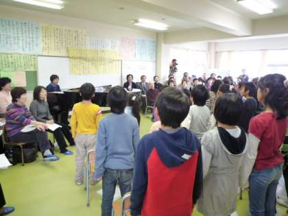 6校時、音楽の中山先生が3年4組の子どもたちと研究授業を行いました。たくさんの音楽の先生が参加したなかで、子どもたちが学習発表会で演じた「森は生きている」の歌を一生懸命歌ってくれました。サプライズで、なんと「森は生きている」の作曲者の林光さんも講師としていらっしゃり、子どもたちに生演奏を弾いてくださったり、一緒に合唱をしてくださったりしました。子どもたちが、生き生きとたくさんの歌を披露してくれるようすが、とてもうれしかったです。