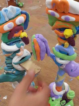 絵具を混ぜた粘土と針金を使って、動きのある人形を工夫してつくっています。どんな作品になるか、お楽しみに…。