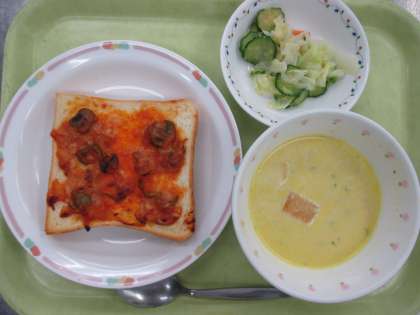 ピザトースト 牛乳 がぼちゃのポタージュ フレンチサラダ