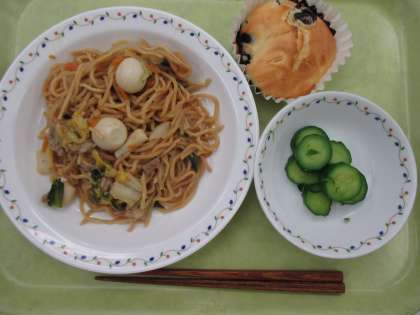 五目焼きそば 牛乳 きゅうりの甘酢かけ ブルーベリーマフィン