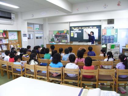 今日から来週にかけて、2年生では「お話バスケット」の皆さん方によるブックトークが行われます。今日は、図書室の書棚の本はどのような決まりで並べられているか、簡単な動物関係の本を例に、わかりやすく楽しく教えてくれました。3桁の百の位の数字の4は、「理科関係」、十の位の8は「動物」、一の位の・・・・・。子どもたちは書棚の秘密を教えてもらって、「じゃ、470はなんですか?」とか書棚をぐるっと見回して数字のところを読んでいたり、興味が湧いてくる様子でした。また、各学級には「こん虫の本・しょくぶつの本」も届けられ、2年生の教室は楽しい読書ができる環境に変わっています。
