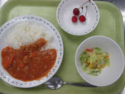 ハッシュドポークライス 牛乳 コーンサラダ 果物(さくらんぼ)